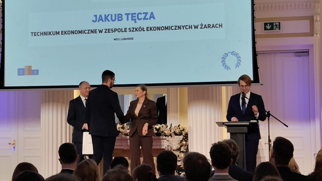 Wśród nagrodzonych znalazł się reprezentant Zespołu Szkół Ekonomicznych w Żarach : Jakub Tęcza zwycięzca Olimpiady Wiedzy i Umiejętności Menedżerskich wraz ze swoim opiekunem merytorycznym Małgorzatą Smużniak.